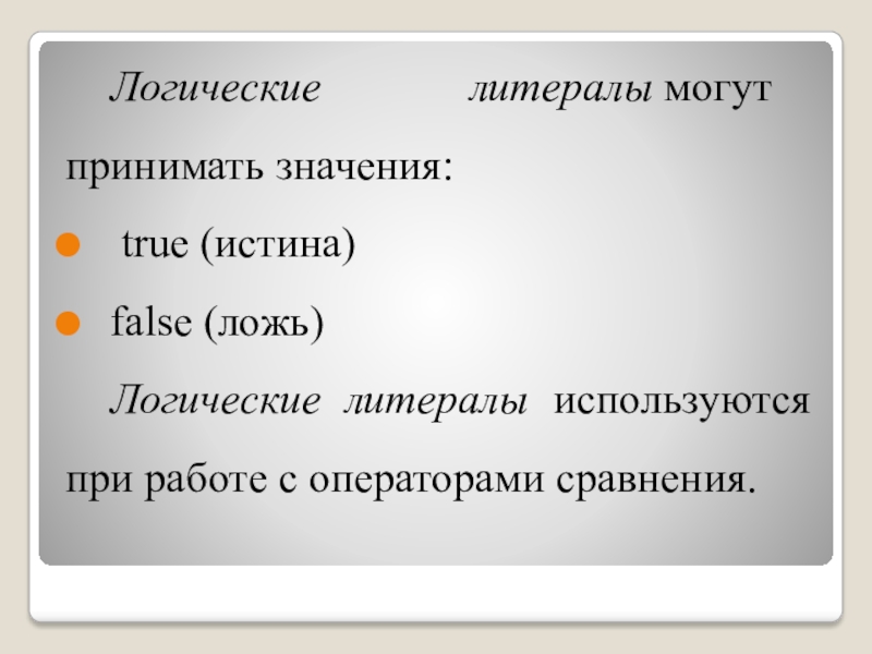 Слайд 14Логические литералы могут принимать значения: