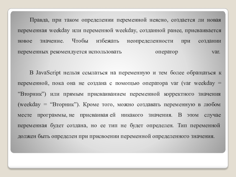 Слайд 19Правда, при таком определении переменной неясно, создается ли новая переменная weekday