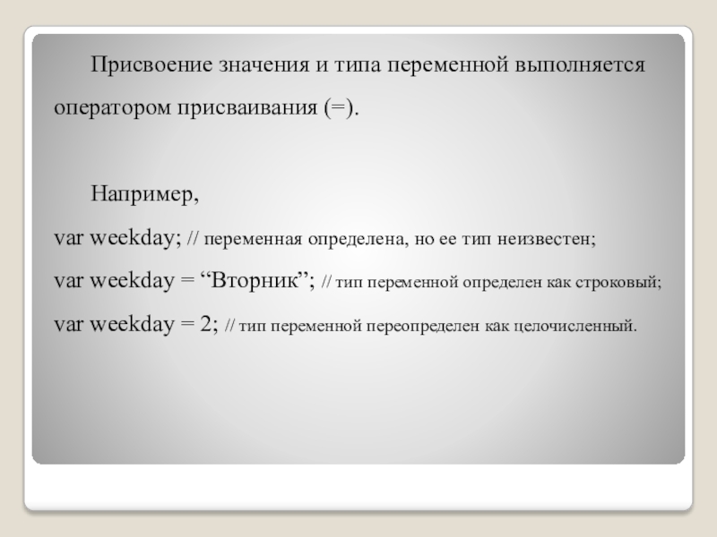 var weekday = “Вторник”; // тип переменной определен как строковый;