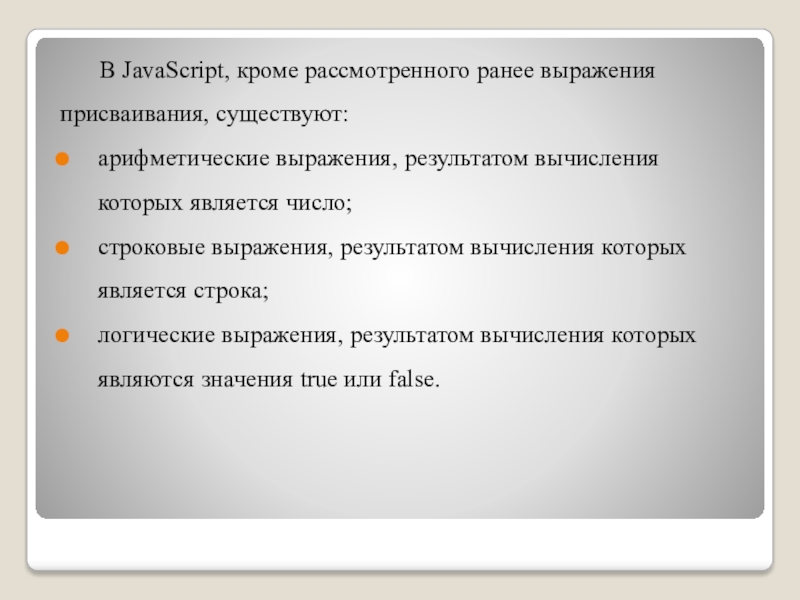 Слайд 23 В JavaScript, кроме рассмотренного ранее выражения присваивания, существуют:
