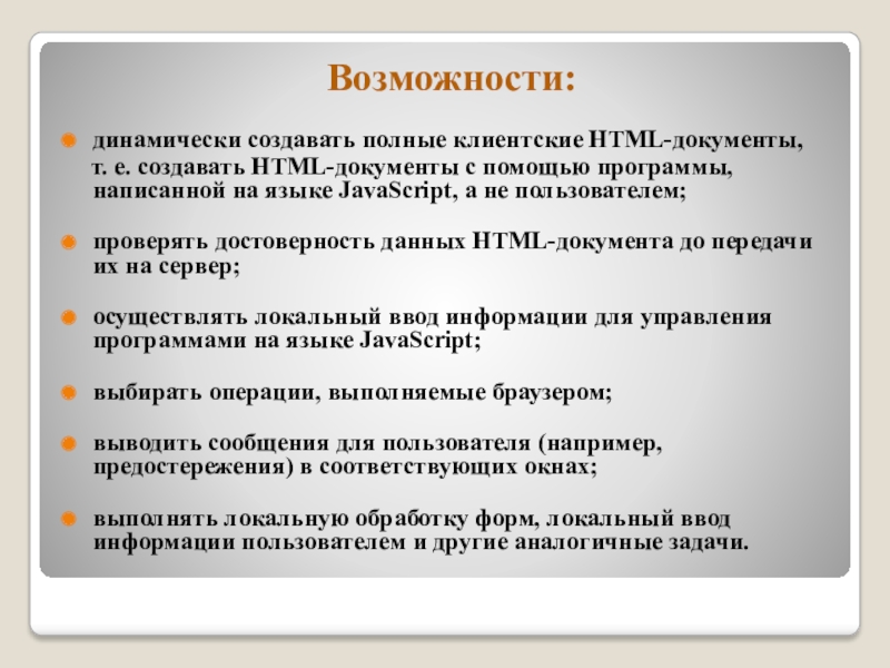 выполнять локальную обработку форм, локальный ввод информации пользователем и другие аналогичные задачи.