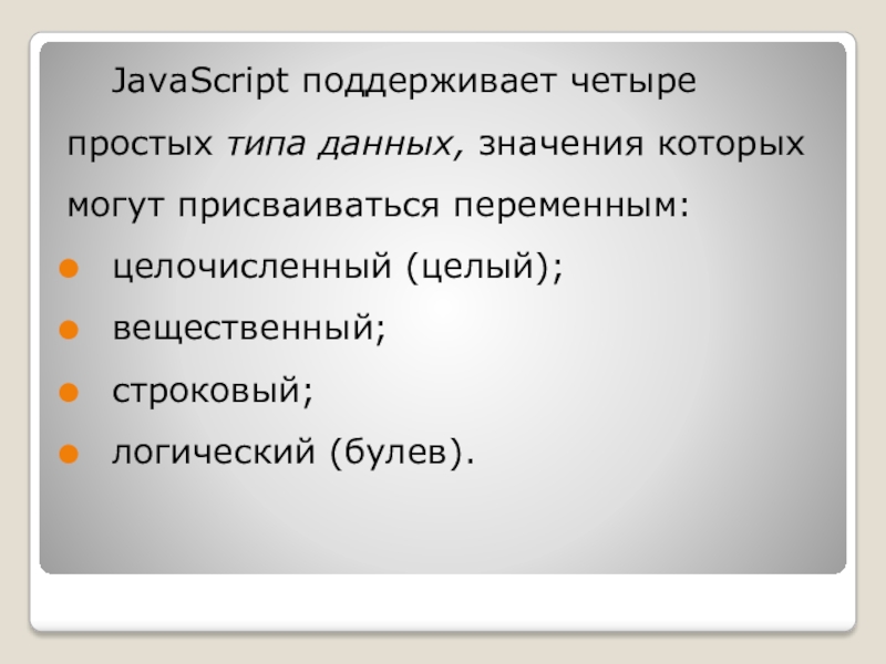 Слайд 9JavaScript поддерживает четыре простых типа данных, значения которых могут присваиваться переменным: