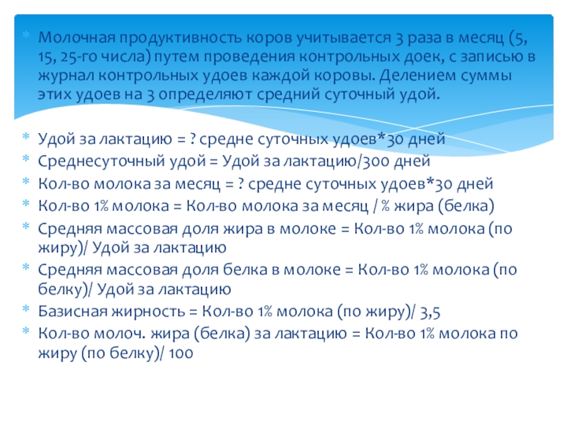 Слайд 7Молочная продуктивность коров учитывается 3 раза в месяц (5, 15, 25-го
