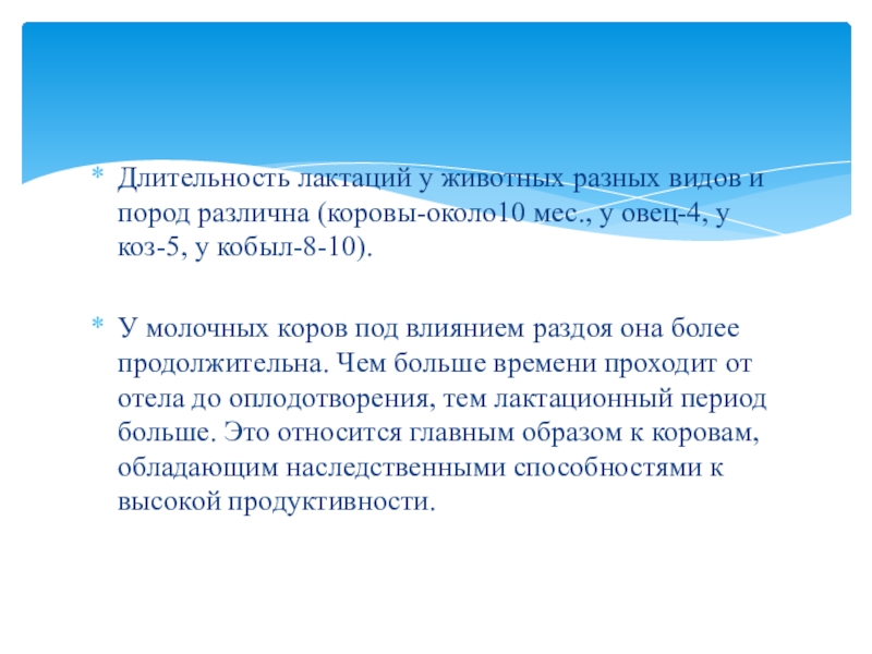 Слайд 6Длительность лактаций у животных разных видов и пород различна (коровы-около10 мес.,