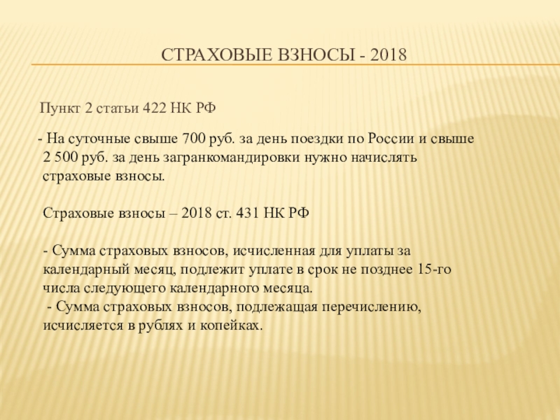 На суточные свыше 700 руб. за день поездки по России и свыше 2 500 руб. за день загранкомандировки нужно начислять страховые взносы.