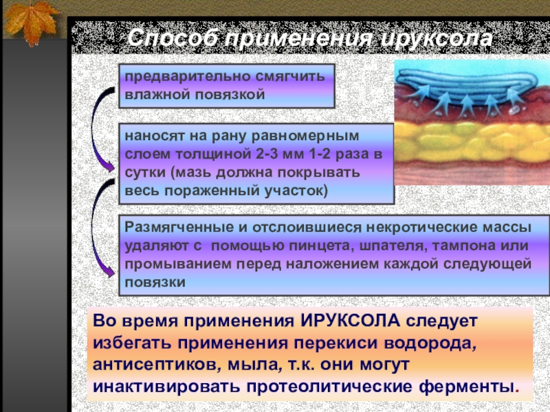 Во время применения ИРУКСОЛА следует избегать применения перекиси водорода, антисептиков, мыла, т.к. они могут инактивировать протеолитические ферменты.