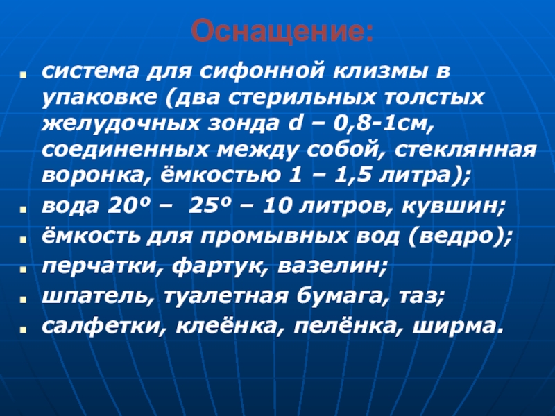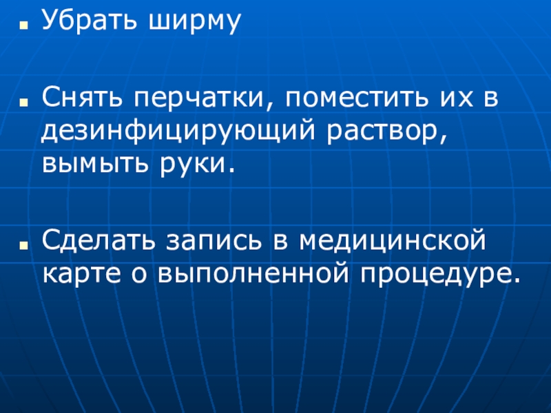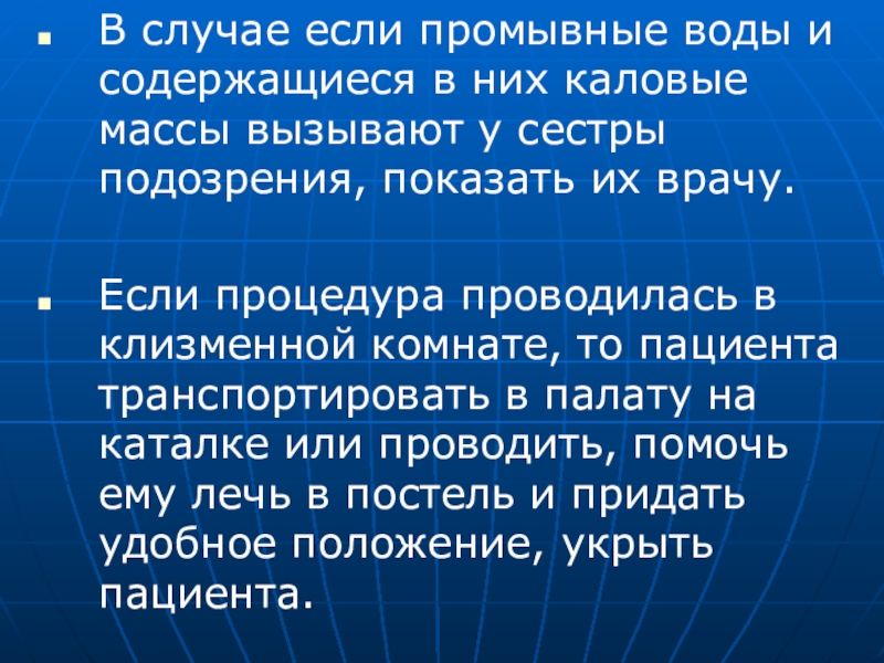 Если процедура проводилась в клизменной комнате, то пациента транспортировать в палату на каталке или проводить, помочь ему лечь в постель и придать удобное положение, укрыть пациента.