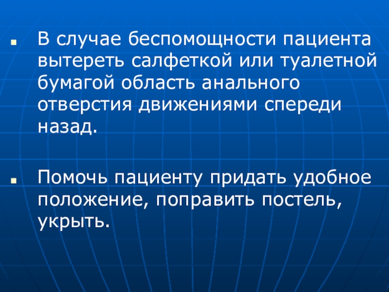 В случае беспомощности пациента вытереть салфеткой или туалетной бумагой область анального