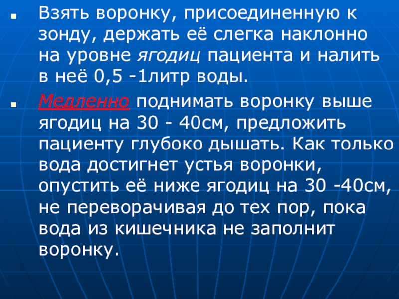 Медленно поднимать воронку выше ягодиц на 30 - 40см, предложить пациенту глубоко дышать. Как только вода достигнет устья воронки, опустить её ниже ягодиц на 30 -40см, не переворачивая до тех пор, пока вода из кишечника не заполнит воронку.