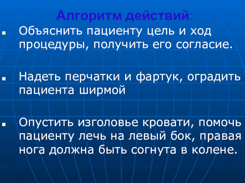 Опустить изголовье кровати, помочь пациенту лечь на левый бок, правая нога должна быть согнута в колене.