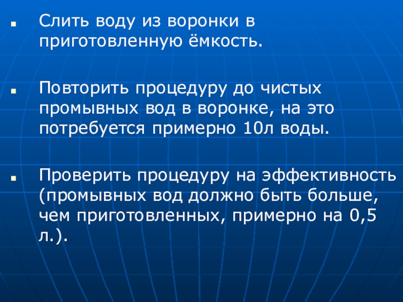 Проверить процедуру на эффективность (промывных вод должно быть больше, чем приготовленных, примерно на 0,5л.).