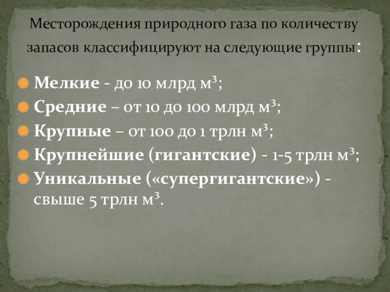 Месторождения природного газа по количеству запасов классифицируют на следующие группы: