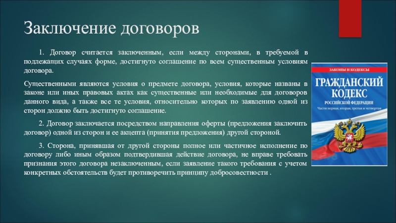 Заключение договоров	1. Договор считается заключенным, если между сторонами, в требуемой в подлежащих случаях форме, достигнуто соглашение по