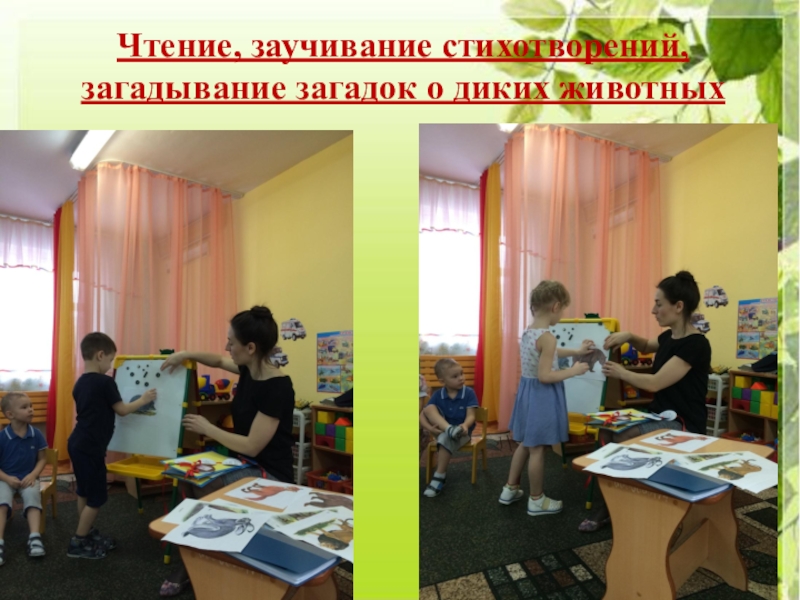 Слайд 9Чтение, заучивание стихотворений, загадывание загадок о диких животных