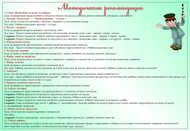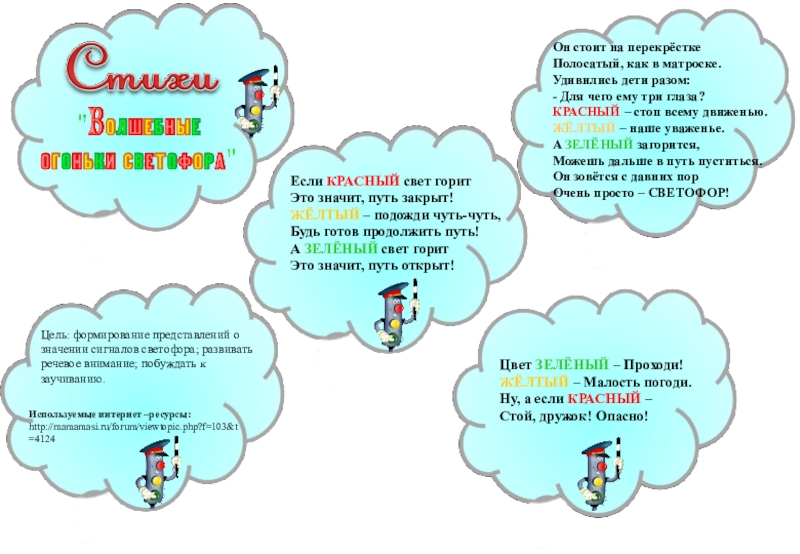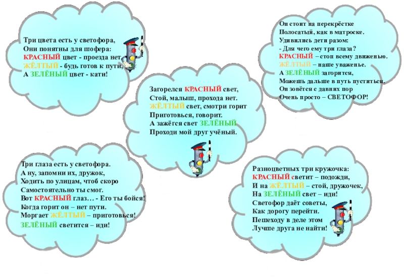 Цель: формирование представлений о значении сигналов светофора; развивать речевое внимание; побуждать к заучиванию.