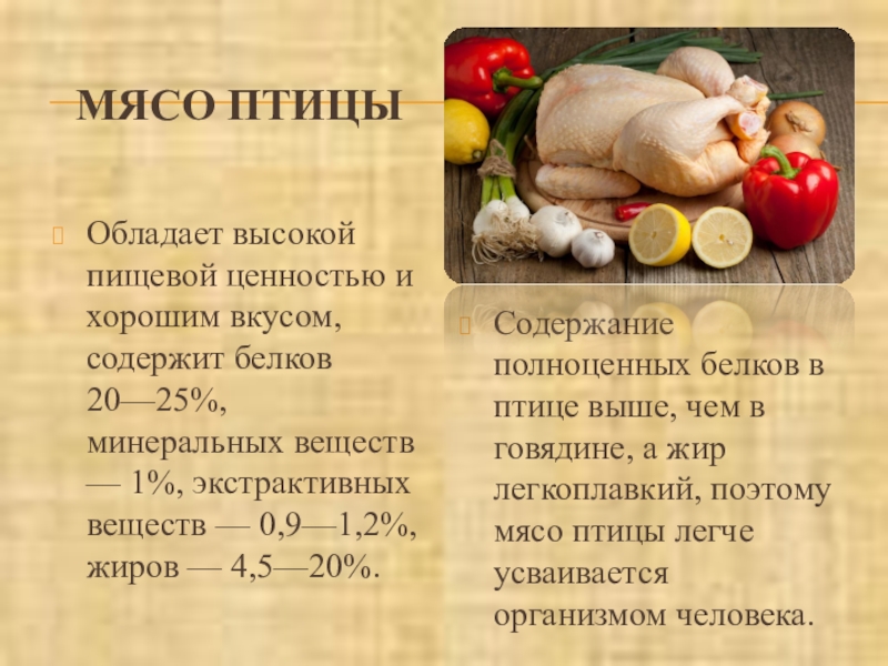 Содержание полноценных белков в птице выше, чем в говядине, а жир легкоплавкий, поэтому мясо птицы легче усваивается организмом человека.