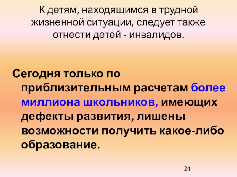 Сегодня только по приблизительным расчетам более миллиона школьников, имеющих дефекты развития, лишены возможности получить какое-либо образование.