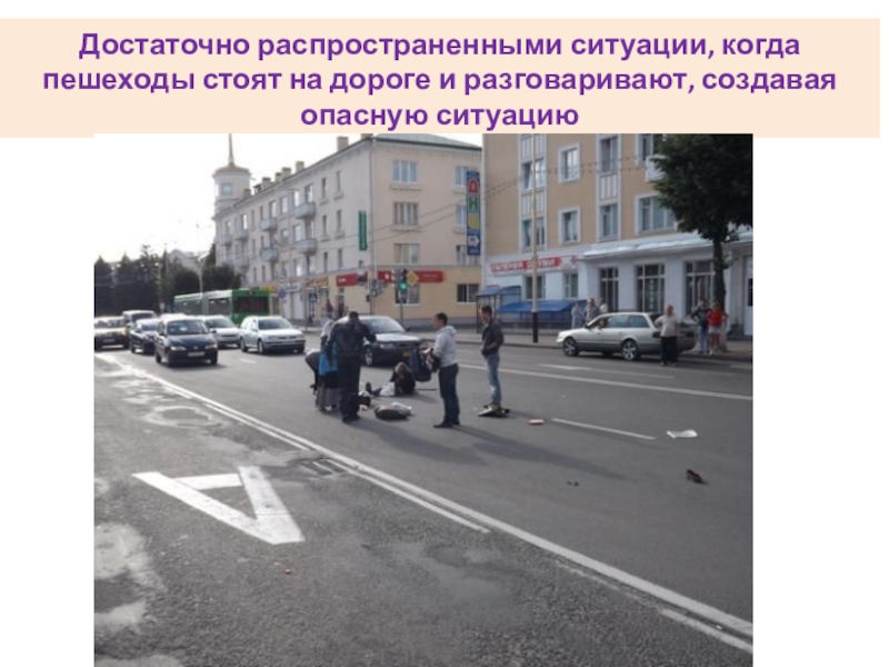 Слайд 11Достаточно распространенными ситуации, когда пешеходы стоят на дороге и разговаривают, создавая