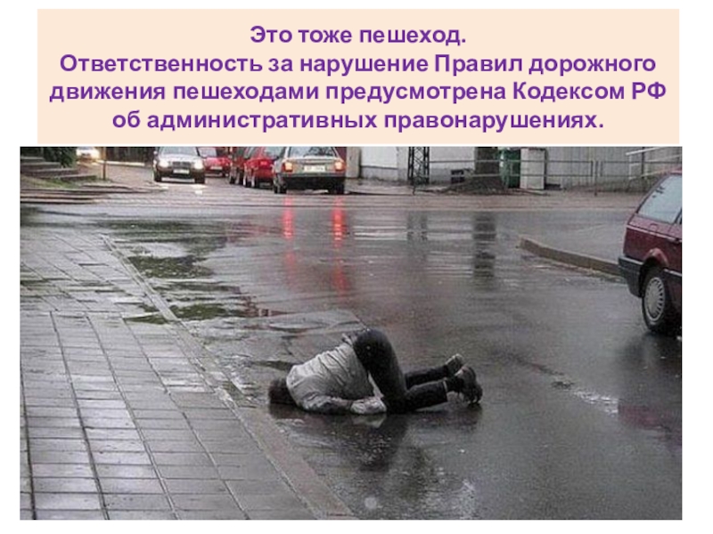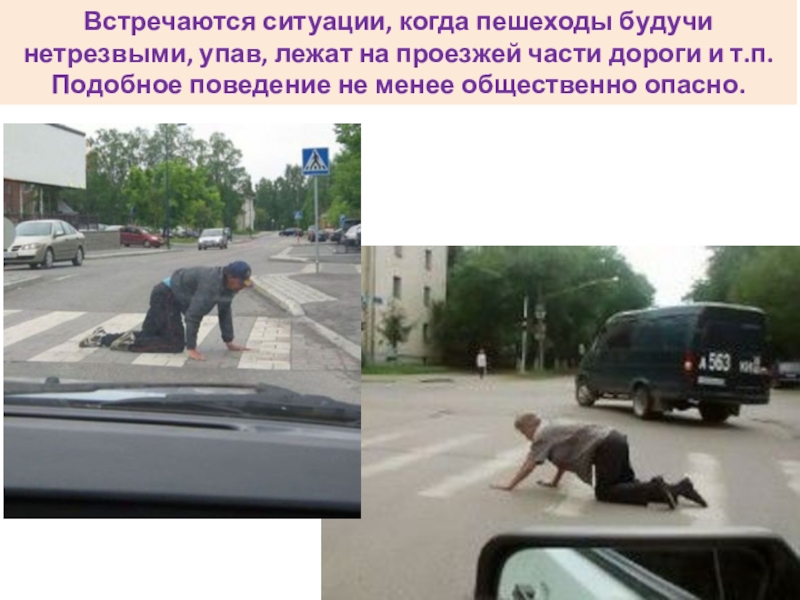 Слайд 12Встречаются ситуации, когда пешеходы будучи нетрезвыми, упав, лежат на проезжей части