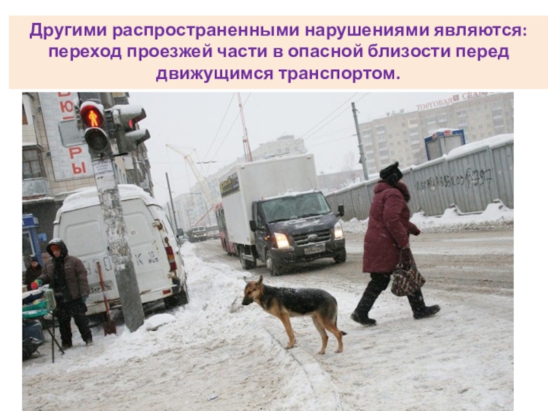 Слайд 9Другими распространенными нарушениями являются: переход проезжей части в опасной близости перед