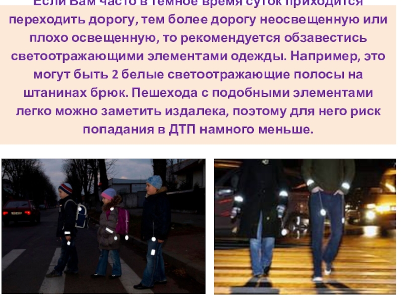 более дорогу неосвещенную или плохо освещенную, то рекомендуется обзавестись светоотражающими элементами одежды. Например, это могут быть 2 белые светоотражающие полосы на штанинах брюк. Пешехода с подобными элементами легко можно заметить издалека, поэтому для него риск попадания в ДТП намного меньше.