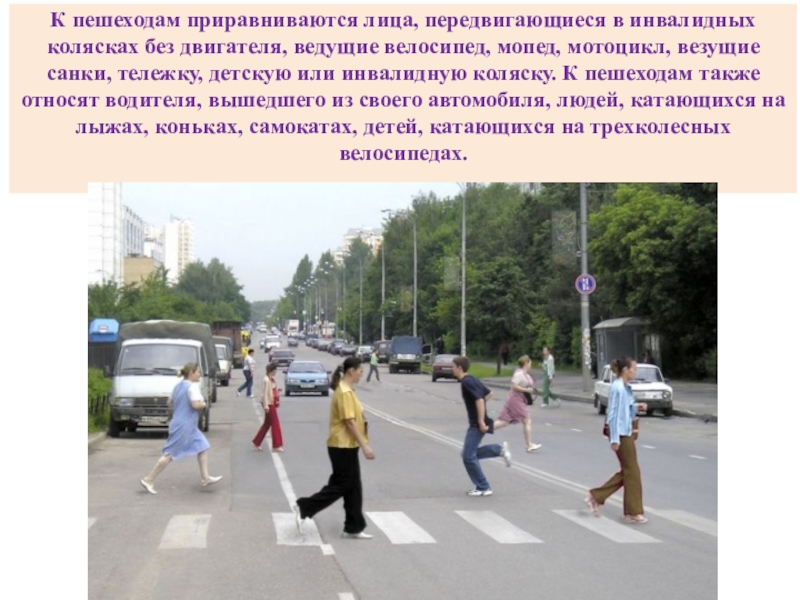 Слайд 5К пешеходам приравниваются лица, передвигающиеся в инвалидных колясках без двигателя, ведущие