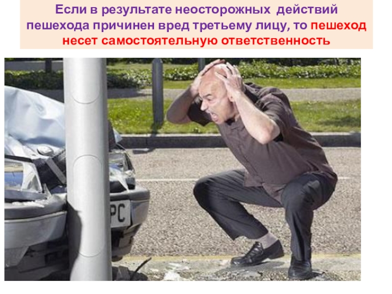 Слайд 15Если в результате неосторожных действий пешехода причинен вред третьему лицу, то