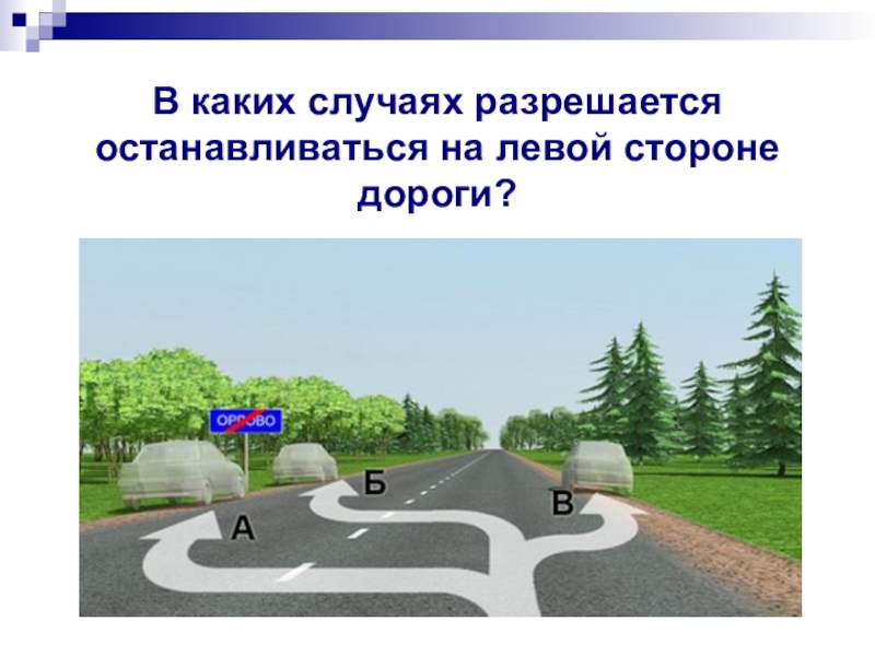 Слайд 27В каких случаях разрешается останавливаться на левой стороне дороги?