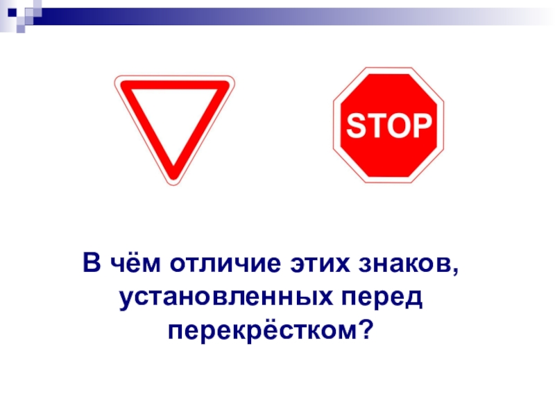 Слайд 4В чём отличие этих знаков, установленных перед перекрёстком?