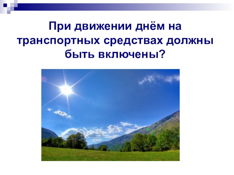 Слайд 35При движении днём на транспортных средствах должны быть включены?