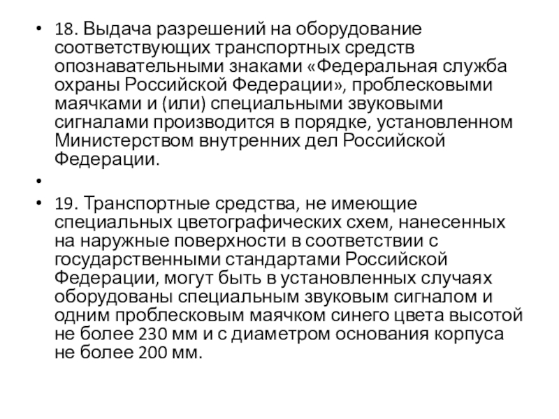 19. Транспортные средства, не имеющие специальных цветографических схем, нанесенных на наружные поверхности в соответствии с государственными стандартами Российской Федерации, могут быть в установленных случаях оборудованы специальным звуковым сигналом и одним проблесковым маячком синего цвета высотой не более 230 мм и с диаметром основания корпуса не более 200 мм.