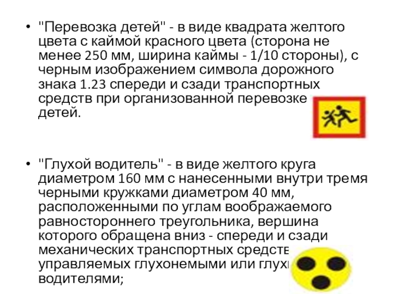 Слайд 8"Перевозка детей" - в виде квадрата желтого цвета с каймой красного