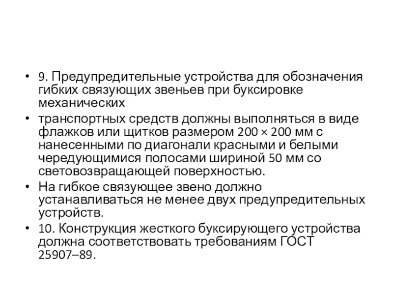 10. Конструкция жесткого буксирующего устройства должна соответствовать требованиям ГОСТ 25907–89.