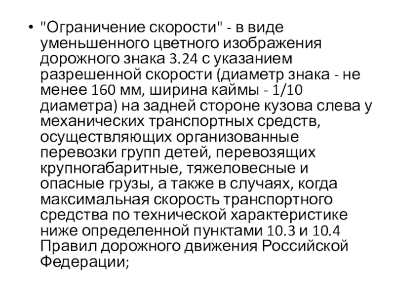 с указанием разрешенной скорости (диаметр знака - не менее 160 мм, ширина каймы - 1/10 диаметра) на задней стороне кузова слева у механических транспортных средств, осуществляющих организованные перевозки групп детей, перевозящих крупногабаритные, тяжеловесные и опасные грузы, а также в случаях, когда максимальная скорость транспортного средства по технической характеристике ниже определенной пунктами 10.3 и 10.4 Правил дорожного движения Российской Федерации;