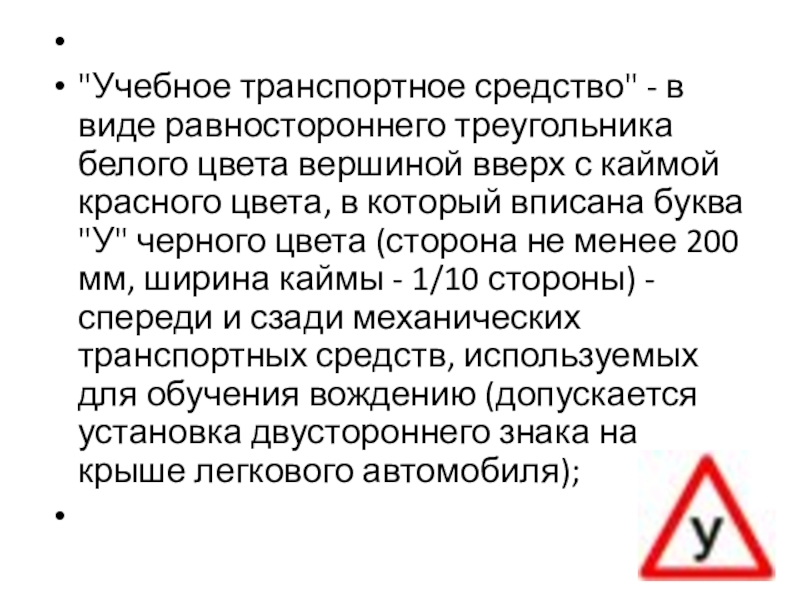 вверх с каймой красного цвета, в который вписана буква "У" черного цвета (сторона не менее 200 мм, ширина каймы - 1/10 стороны) - спереди и сзади механических транспортных средств, используемых для обучения вождению (допускается установка двустороннего знака на крыше легкового автомобиля);