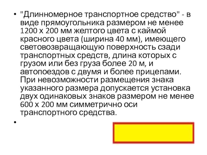 х 200 мм желтого цвета с каймой красного цвета (ширина 40 мм), имеющего световозвращающую поверхность сзади транспортных средств, длина которых с грузом или без груза более 20 м, и автопоездов с двумя и более прицепами. При невозможности размещения знака указанного размера допускается установка двух одинаковых знаков размером не менее 600 х 200 мм симметрично оси транспортного средства.