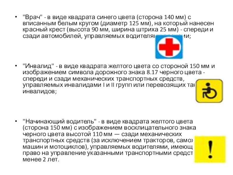 "Начинающий водитель" - в виде квадрата желтого цвета (сторона 150 мм) с изображением восклицательного знака черного цвета высотой 110 мм — сзади механических транспортных средств (за исключением тракторов, самоходных машин и мотоциклов), управляемых водителями, имеющими право на управление указанными транспортными средствами менее 2 лет.