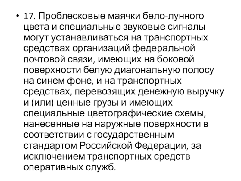 Слайд 2417. Проблесковые маячки бело-лунного цвета и специальные звуковые сигналы могут устанавливаться