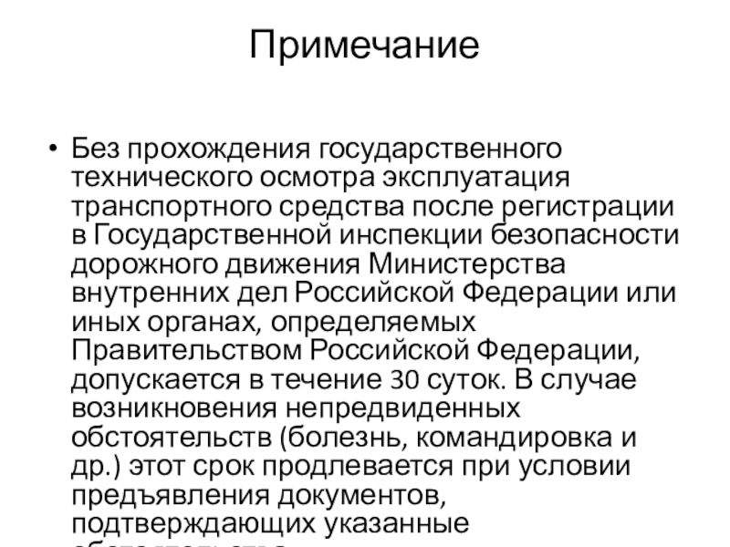Государственной инспекции безопасности дорожного движения Министерства внутренних дел Российской Федерации или иных органах, определяемых Правительством Российской Федерации, допускается в течение 30 суток. В случае возникновения непредвиденных обстоятельств (болезнь, командировка и др.) этот срок продлевается при условии предъявления документов, подтверждающих указанные обстоятельства.