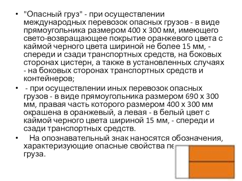 - при осуществлении иных перевозок опасных грузов - в виде прямоугольника размером 690 х 300 мм, правая часть которого размером 400 х 300 мм окрашена в оранжевый, а левая - в белый цвет с каймой черного цвета шириной 15 мм, - спереди и сзади транспортных средств.
