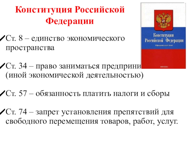 Ст. 74 – запрет установления препятствий для свободного перемещения товаров, работ, услуг.