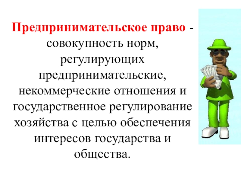 Слайд 3Предпринимательское право - совокупность норм, регулирующих предпринимательские, некоммерческие отношения и государственное