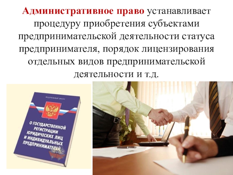Слайд 10Административное право устанавливает процедуру приобретения субъектами предпринимательской деятельности статуса предпринимателя, порядок