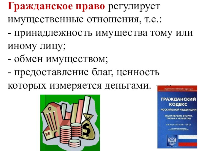 Слайд 9Гражданское право регулирует имущественные отношения, т.е.: