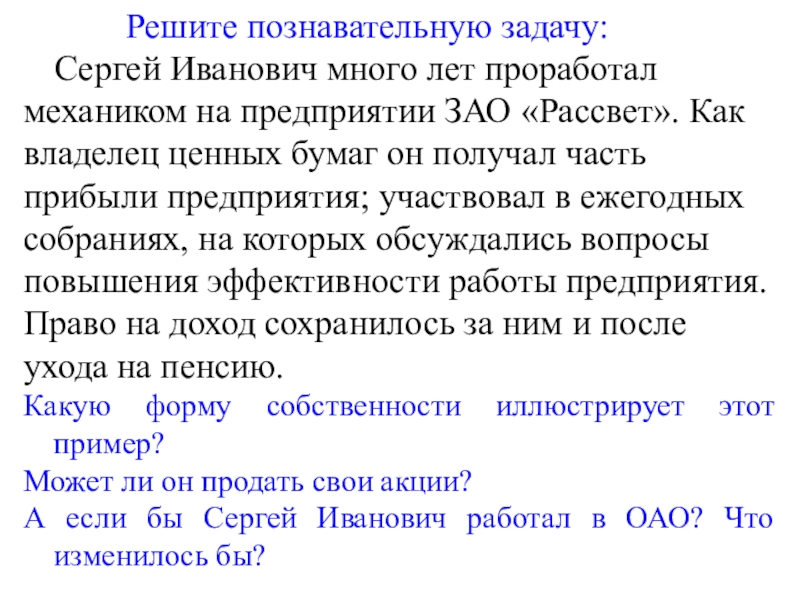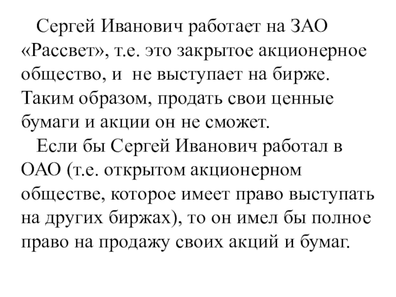 Слайд 30Сергей Иванович работает на ЗАО «Рассвет», т.е. это закрытое акционерное общество,
