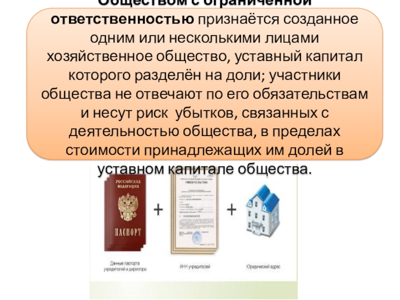 Слайд 20Обществом с ограниченной ответственностью признаётся созданное одним или несколькими лицами хозяйственное