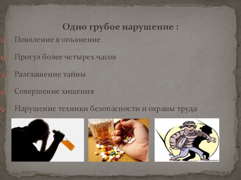 Одно грубое нарушение :Появление в опьянение Прогул более четырех часовРазглашение тайныСовершение хищенияНарушение техники безопасности и охраны труда