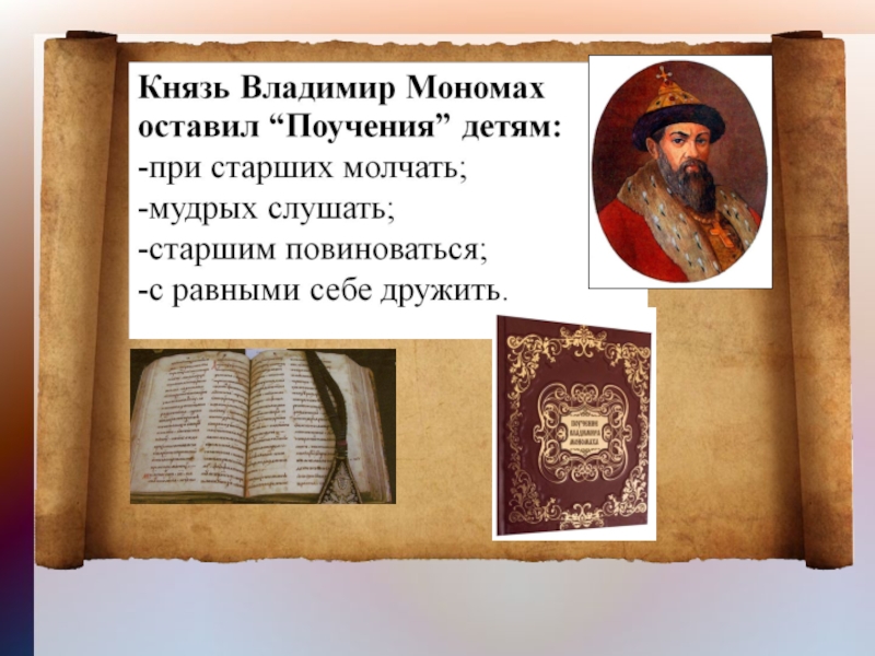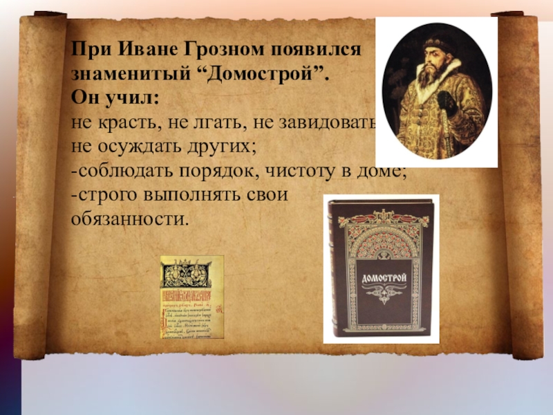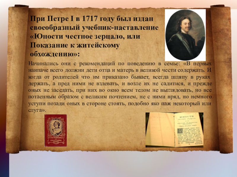 Начинались они с рекомендаций по поведению в семье: «В первых наипаче всего должни дети отца и матерь в великой чести содержать. И когда от родителей что им приказано бывает, всегда шляпу в руках держать, а пред ними не вздевать, и возле их не садитися, и прежде оных не заседать, при них во окно всем телом не выглядовать, но все потаенным образом с великим почтением, не с ними вряд, но немного уступи позади оных в стороне стоять, подобно яко паж некоторый или слуга».