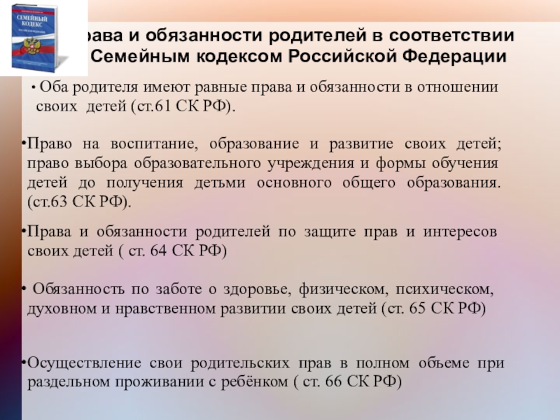 Обязанность по заботе о здоровье, физическом, психическом, духовном и нравственном развитии своих детей (ст. 65 СК РФ)