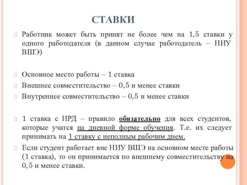 Если студент работает вне НИУ ВШЭ на основном месте работы (1 ставка), то он принимается по внешнему совместительству на 0,5 и менее ставки.